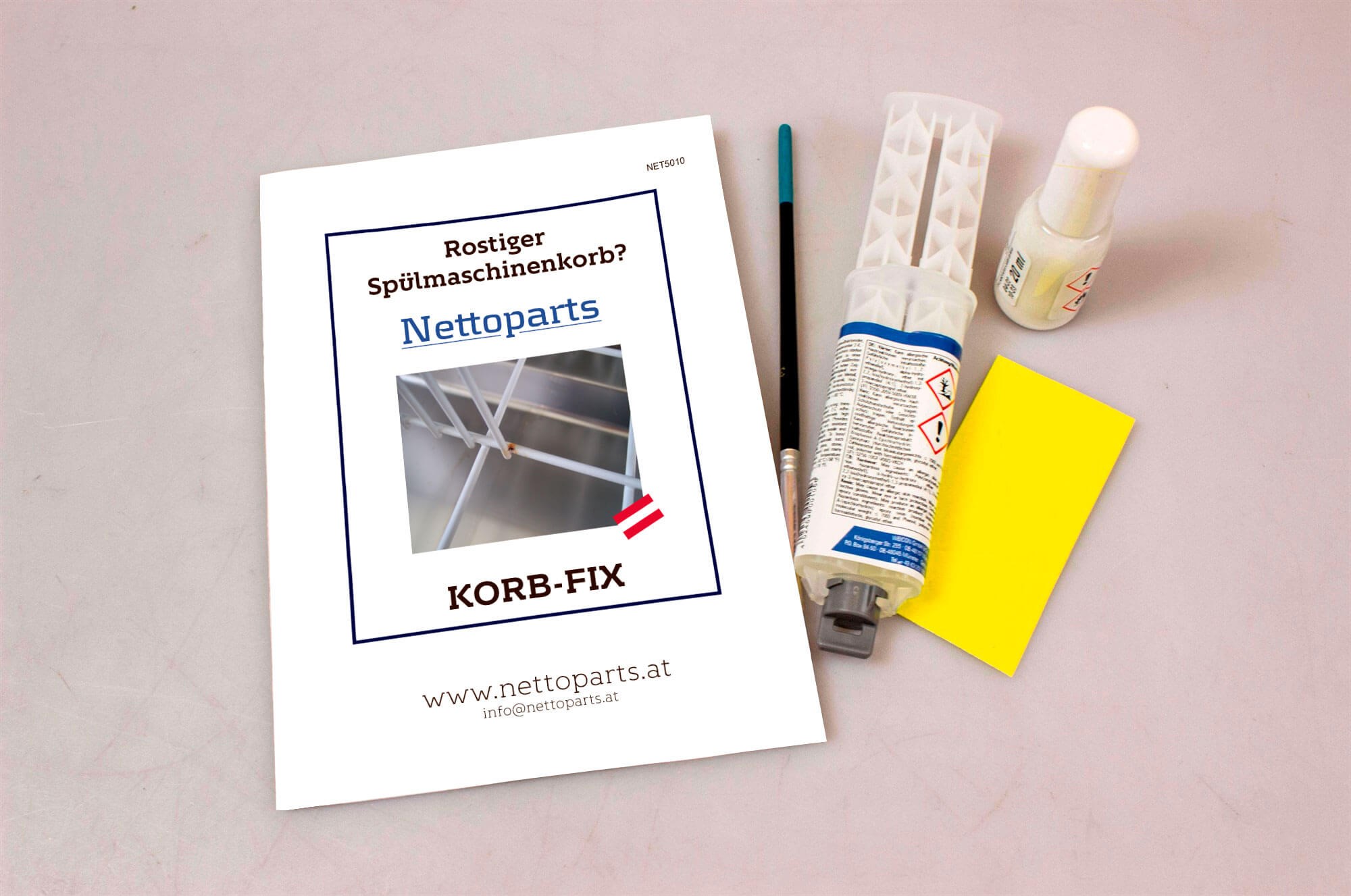 Versuchen Sie Nettoparts' Reparations Set 'Geschirrkorb-Fix' - ein Heimwerker Produkt, welches Rostschäden bei den Körben Ihres Geschirrspülers ausbessern kann.